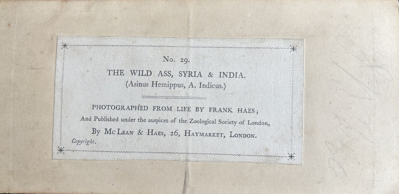 Above: London Zoo (note that the Syrian wild ass is actually on the right of frame contrary to the labelling on the rear). Front and back of stereoview No. 29 by Frank Haes from his first series (No. 1 to No. 55) of 1864. Held in a private collection. Photo: Ken Wallis. Reproduced with permission.