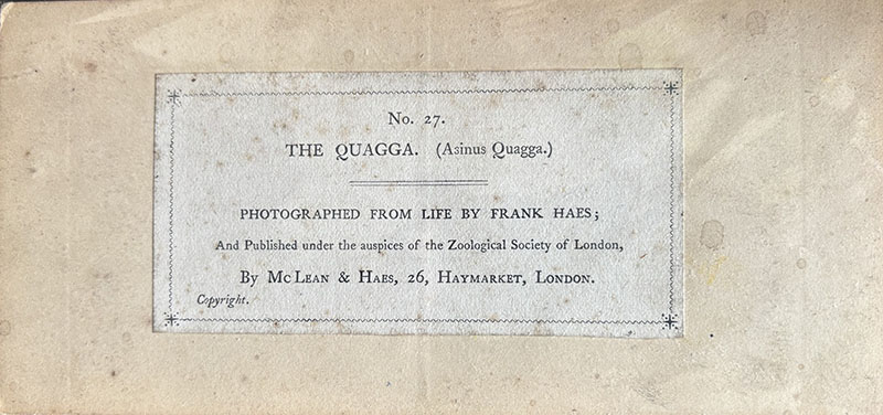 Above: Quagga mare at London Zoo. Photo taken by Frank Haes in 1864. The front and back of the stereoview. Held in a private collection. Photo: Ken Wallis. Reproduced with permission.