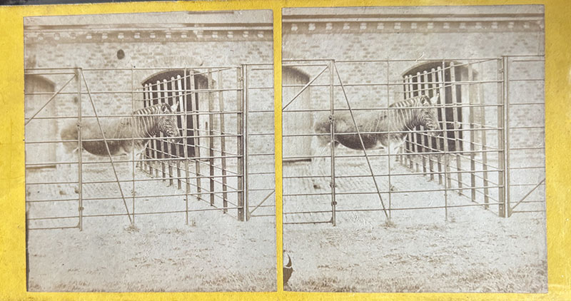 This is the fourth of the London photos to be recorded as a stereoview, discovered by collector Ken Wallis. It is No. 27 of the first series, confirming that there are multiple variants of the Quagga stereoview from the first series. Note the bracing bar to the immediate right of the lock as in the first and better known variant of this stereoview above.