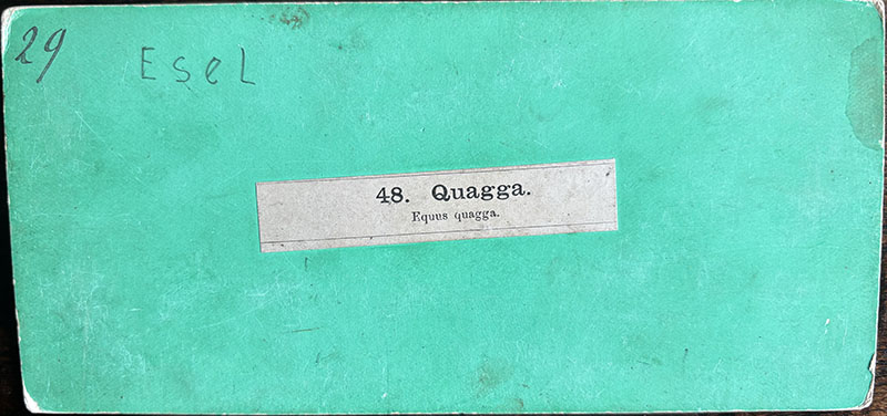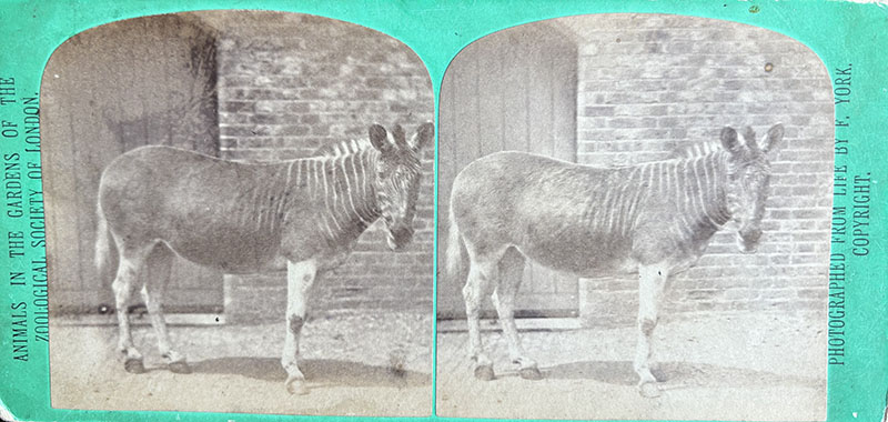 Above: Quagga mare at London Zoo. Photo taken by Frederick York in Summer 1870. The front and back of the stereoview on green card. Held in a private collection. Photo: Ken Wallis. Reproduced with permission.